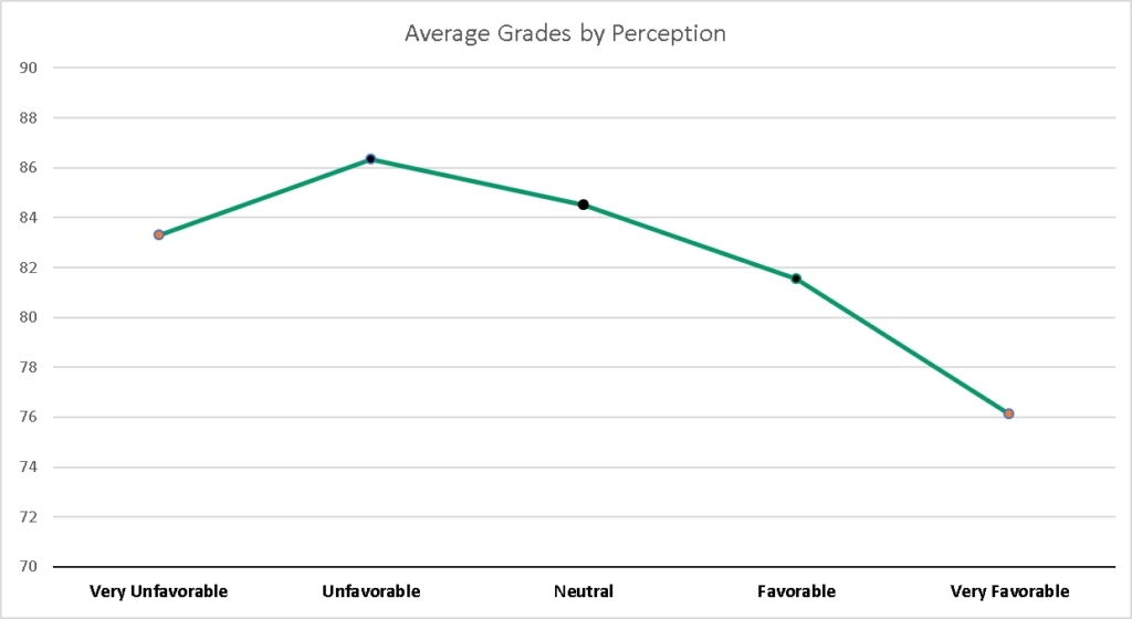 Students, on average, tend to have more neutral views regarding AI as opposed to extreme views, and those with the extreme views tend to have worse student outcomes. There may be a nonlinear relationship between the variables of achievement and AI perceptions, but this study only revealed the slight, but significant, presence of such a relationship.