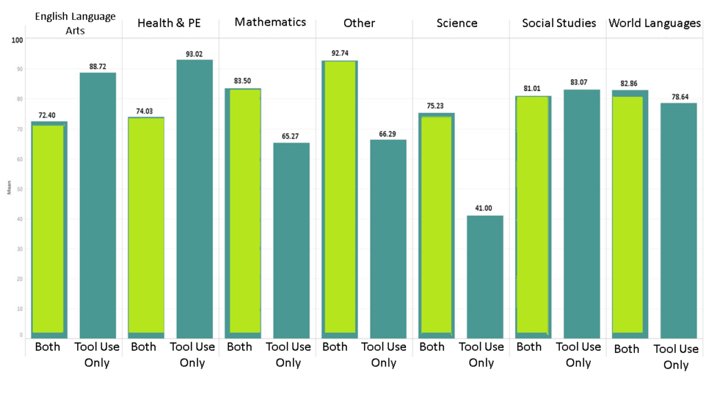 Students in English courses with AI “as a tool” only scored higher than those that used it for both, which may mean that AI usage “as a tool” is more effective in that area for ELA assignments, such as writing.