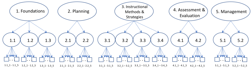 The blended teaching competency model that was initially developed during Phase 1 of the research had two levels as shown in Figure 1. This model is what we have begun to refer to as the process model because its top-level structure is process-oriented (e.g., planning, methods, assessment/evaluation, management). At the second-level, you begin to see constructs specific to blended teaching. The process model was quite comprehensive, but also made it hard to emphasize some important pedagogical concepts to blended teaching, like real-time data practices or personalization, that had elements distributed across multiple constructs. Additionally, the complexity inherent in a model with five top-level constructs, 13 sub-constructs, and 65 items, introduced measurement challenges as well as challenges to designing professional development aligned with each of the constructs.