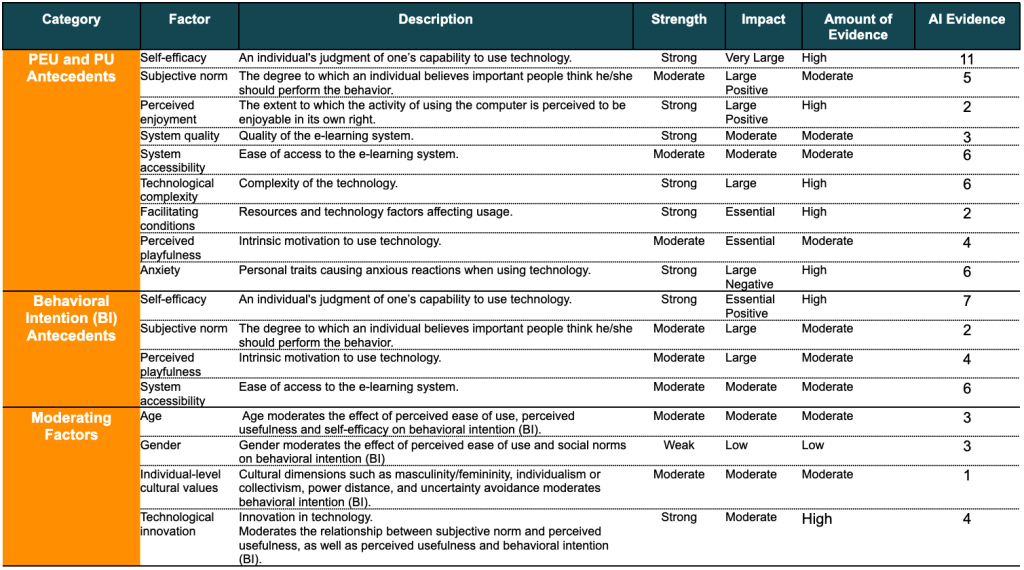The table of findings (Table 1) and subsequent text presents a comprehensive overview of factors influencing technology acceptance among educators based on a meta-analysis of the subject. The factors are categorized into three main groups: antecedents of Perceived Ease of Use (PEU) and Perceived Usefulness (PU), antecedents of Behavioral Intention (BI), and moderating factors, each of which are defined as follows: