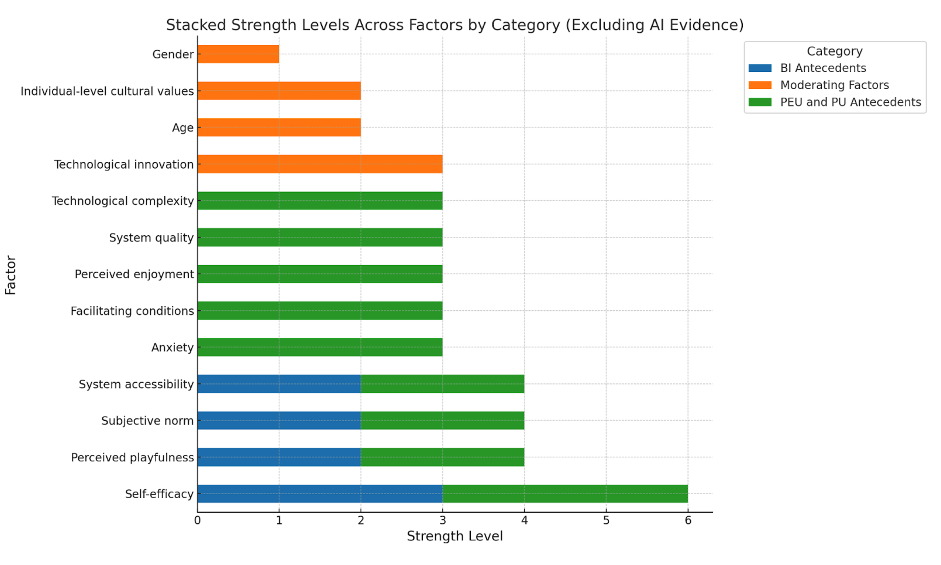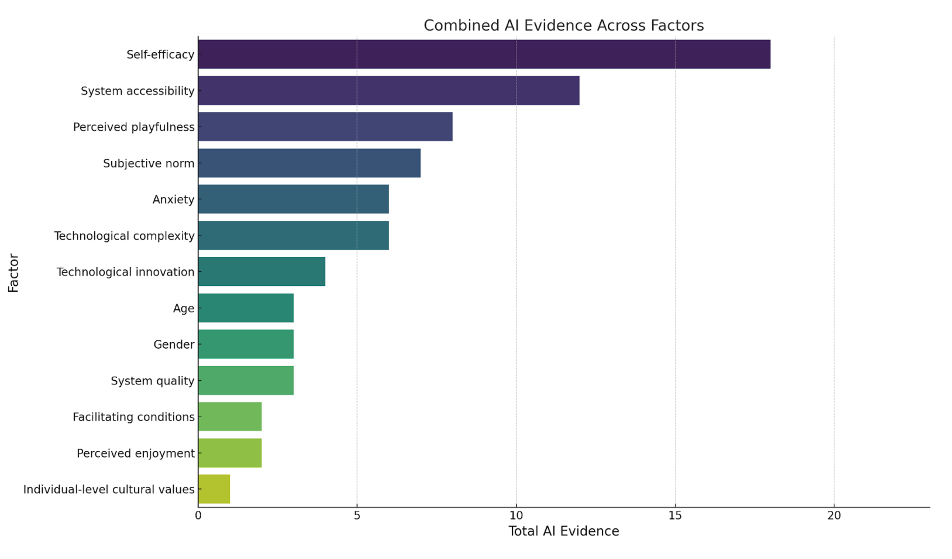 Below is a visual that organizes the amount of evidence (number of studies) that supports a TAM variable’s importance when it comes to AI adoption as the dependent variable as opposed to general technology adoption.