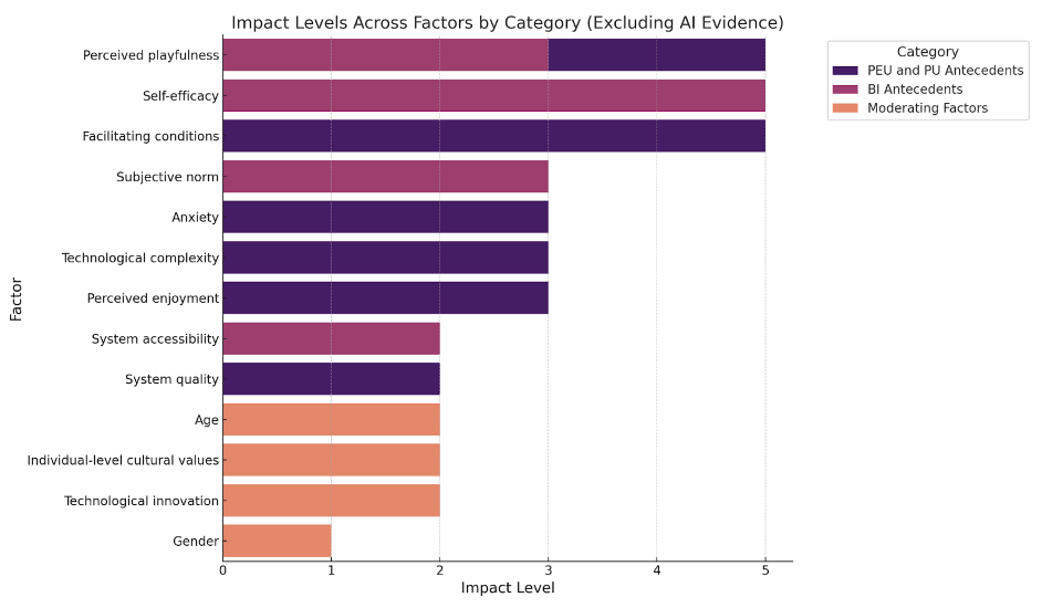 Below are two figures that visualize the strengths (Figure 1) and the impacts (Figure 2) of each variable in the TAM according to the AI assisted analysis. It is important to note that the values used to make these comparisons were calculated by AI, as described in the methodology section, but are summarized into categorical bins in Table 1.