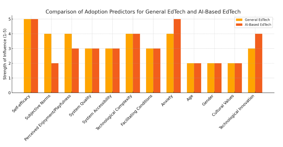 To make sense of the large amount of information gathered, the researcher attempted to estimate the strength of influence of each of the factors given their outcome: General EdTech adoption or AI-Based EdTech adoption. While there is much more evidence for these factors in general EdTech adoption, the research took into consideration both the amount of literature available on AI adoption and the length of time the tools have been available to perform research and evaluation. Below is a figure (Figure 4) comparing the two types of adoption predictors and their estimated strengths, which were calculated by AI as described earlier.