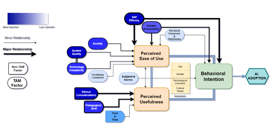 The adoption of AI tools by teachers in educational settings is influenced by a multifaceted array of factors that both align with and extend beyond the traditional components of the Technology Acceptance Model (TAM). While TAM emphasizes Perceived Ease of Use and Perceived Usefulness as central predictors of technology acceptance, the integration of AI-based educational technology requires a deeper examination of additional variables that reflect the unique characteristics and challenges associated with AI technologies (Chocarro et al., 2021; Wang et al., 2021).