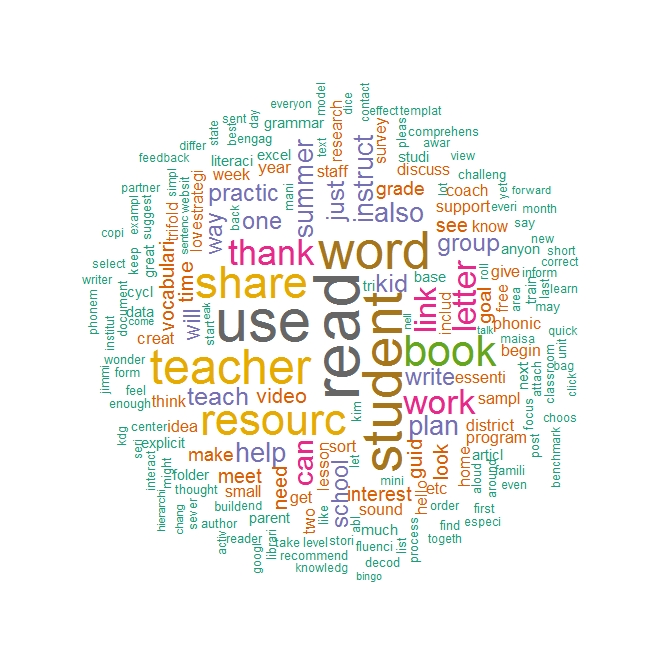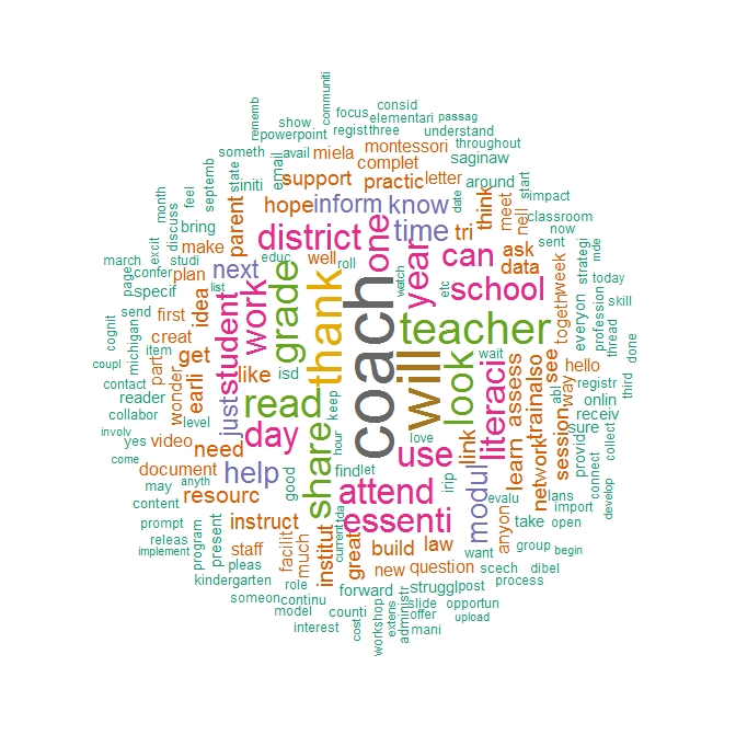 Booth, S. E. (2012). Cultivating knowledge sharing and trust in online communities for educators. Journal of Educational Computing Research, 47(1), 1-31.Borgatti, S. P., Everett, M. G., and Freeman, L. C. (2002). Ucinet for windows: Software for social network analysis. Harvard, MA: Analytic Technologies.Borgatti, S. P., Everett, M. G., and Johnson, J. C., (2013). Analyzing Social Networks. Sage.Braun, V., & Clarke, V. (2013). Successful qualitative research: A practical guide for beginners. Sage.Cardno, C. (2012). Managing effective relationships in education. Sage.Feinerer, I. (2018). Introduction to the tm Package Text Mining in R. Retrieved from https://cran.r-project.org/web/packages/tm/vignettes/tm.pdfIgnatow, G., & Mihalcea, R. (2017). Text mining: A guidebook for the social sciences. Sage Publications.Kacewicz, E., Pennebaker, J. W., Davis, M., Jeon, M., & Graesser, A. C. (2014). Pronoun use reflects standings in social hierarchies. Journal of Language and Social Psychology, 33, 125-143.Kong, K. (2014). Professional discourse. Cambridge University Press.Kwon, J. & DeBruler, K. (2019). Unpacking Network and Discourse of Educators in Professional Learning Communities. In K. Graziano (Ed.), Proceedings of Society for Information Technology & Teacher Education International Conference (pp. 629-639). Las Vegas, NV, United States: Association for the Advancement of Computing in Education (AACE). Retrieved March 29, 2019 from https://www.learntechlib.org/primary/p/207758/.Michigan Public Act § No. 249. (2016). Retrieved from http://www.legislature.mi.gov/documents/2015-2016/publicact/pdf/2016-PA-0249.pdfPennebaker, J. W., Boyd, R. L., Jordan, K., & Blackburn, K. (2015). The development and psychometric properties of LIWC2015.Pennebaker, J. W., Chung, C. K., Frazee, J., Lavergne, G. M., & Beaver, D. I. (2014). When small words foretell academic success: The case of college admissions essays. PloS one, 9(12), e115844.Porter, A. C. (1994). National standards and school improvement in the 1990s: Issues and promise. American Journal of Education, 102, 421–449.Porter, A. C., Floden, R., Freeman, D., Schmidt, W., & Schwille, J. (1988). Content determinants in elementary school mathematics. In D. Grouws & Thomas Cooney (Eds.), Perspectives on research on effective mathematics teaching. Reston, VA: National Council of Teachers of Mathematics.Scott, A., Clarkson, P., & McDonough, A. (2011). Fostering professional learning communities beyond school boundaries. Australian Journal of Teacher Education, 36(6), Article 5.Tausczik, Y. R., & Pennebaker, J. W. (2010). The psychological meaning of words: LIWC and computerized text analysis methods. Journal of language and social psychology, 29(1), 24-54.[1] Michigan's Action Plan for Literacy Excellence. (n.d.). Retrieved from https://www.michigan.gov/mde/0,4615,7-140-28753_74161---,00.html[2] RDataMining.com: R and Data Mining: Text Mining. (n.d.). Retrieved from http://www.rdatamining.com/examples/text-mining