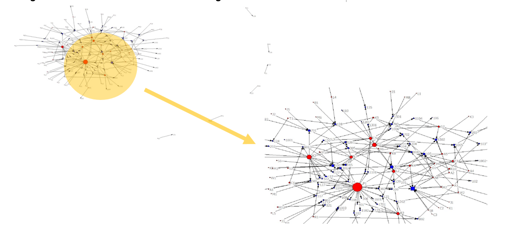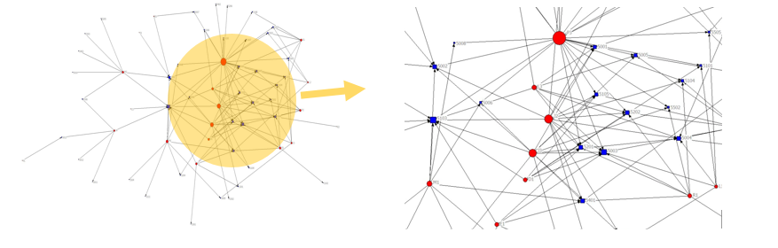 Figure 4. Two-Mode Social Network Diagram of EL Coach Network.Circles in red represent actors who created a post or responded to an initial posting and squares in blue denote postings. Accordingly, both types of nodes in the enlarged part of the network diagram inform who the power users are in the community and in what threads their activities are actively involved. The study team was interested in identifying power users’ behaviors in the professional discourse by relating the SNA results to the original corpora and the facilitating behaviors found were as follow: