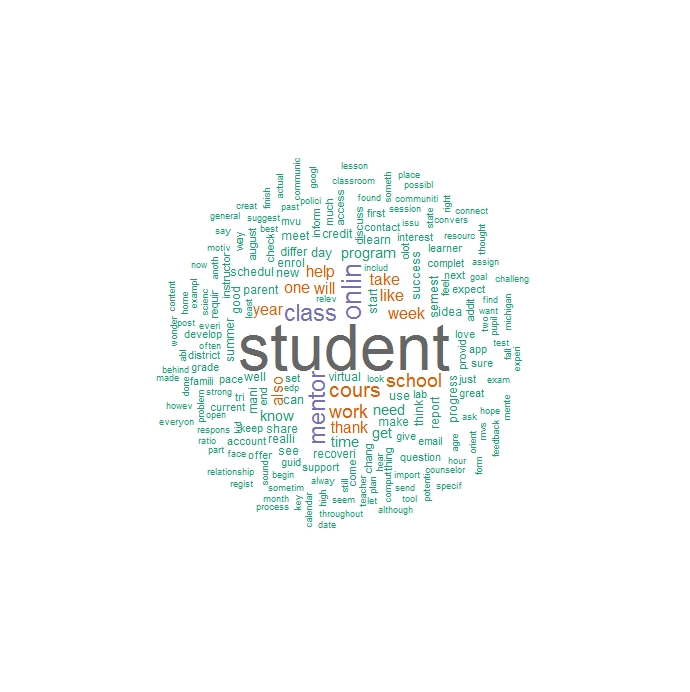 Figure 1. Word-Cloud.Figure 1 presents the three word-clouds. The first word-cloud is for Mentor Network members, and indicates “student,” “online,” and “course” as the most important words in discourses. Text extracts were collated with the conceptual framework (see Kwon & DeBruler [2019] for the conceptual framework used), leading a conclusion that to mentors, as shown in their primary role--advising students who take online courses at the school building, the theme of student learning and/or change emerged as a focal point in their professional discourse.More specifically, those education professionals appear to engage in discursive activities regarding: