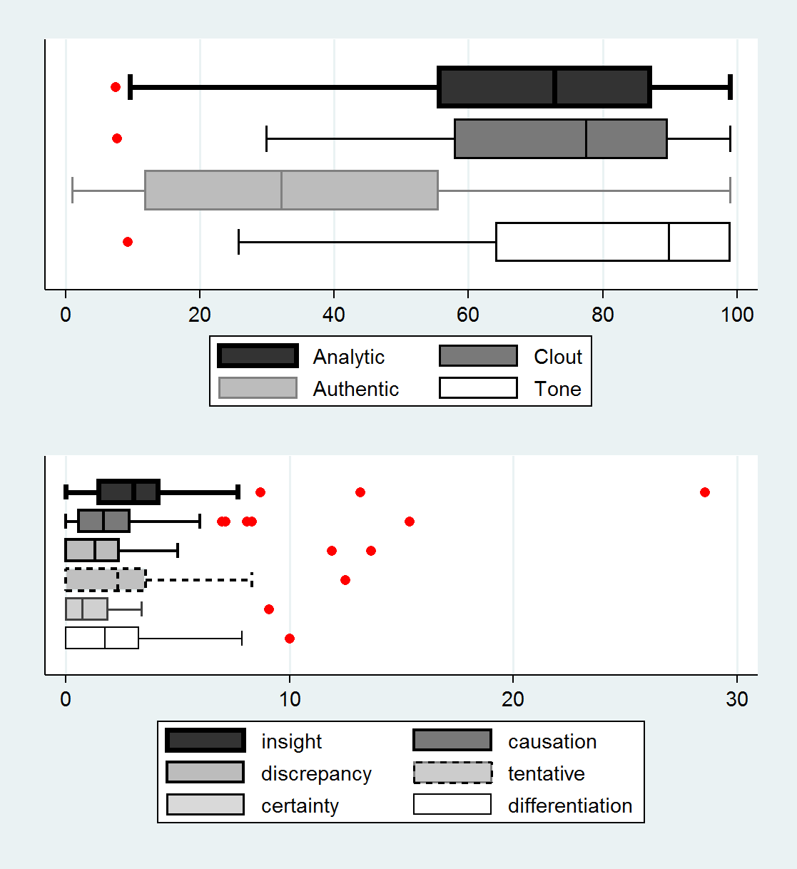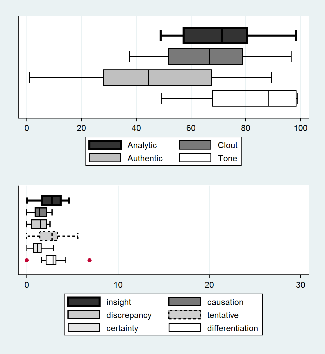 The second method of text mining focused on function words such as pronouns, prepositions, and conjunctions. Exploring those words enabled understanding of another aspect of discourse--social and/or psychological characteristics in the discourse (Tausczik & Pennebaker, 2010). Pennebaker’s team developed Linguistic Inquiry and Word Count (LIWC), a computerized text analysis program. The analysis was based on the program’s key feature referred to as “dictionary” that was composed of almost 6,400 words. Each word was tagged by one or more categories, and LIWC summarized a corpus based on those categories in the dictionary for its LIWC psycho-linguistical characteristics (Pennebaker, Boyd, Jordan, & Blackburn, 2015).Among approximately 90 variables that are generated by LIWC, foundational characteristics of corpora were informed by such variables as word count (hereafter WC), word count per sentence (WCPS), percent of target words included in the dictionary (Dictionary), and percent of words that are greater than six letters in length (WC>6 letters). Other categories including articles, prepositions, pronoun, auxiliary verb, conjunction, adverb, and negation is viewed as a proxy of analytic process behind word usages (Pennebaker, Chung, Frazee, Lavergne, & Beaver, 2014). In particular, the LIWC’s summary variables provided useful information for the four types of linguistic characteristics of discourse: (a) analytical thinking (Analytic), (b) clout (Clout), (c) authenticity (Authentic), and (d) emotional tone (Tone) in the language usage (Pennebaker et al., 2015).Furthermore, other variables focused more on psychological process behind language usages, for instance affective, social, cognitive, perceptual and, biological processes, each of which included sub-categories. The cognitive processes synthesized the psychological aspect of discourse that was captured by such variables as insight (e.g., think, know), causation (e.g., because, effect), discrepancy (e.g., should, would), tentative (e.g., maybe, perhaps), certainty (e.g., always, never), and differentiation (e.g., hasn’t, but, else). We found box-whisker plots useful in visualization to compare the four linguistic summary variables or sub-categories within the cognitive processes.Table 1 presents part of the aforementioned LIWC results. Since LIWC manual (Pennebaker et al., 2015) reports results from analyzing a variety of corpora that were used in developing and validating the program, we could get a sense of the degree to which the certain characteristics emerged more strongly by comparing the study sample with those text samples. For this report, we chose Blog, Twitter, and NY Times samples.Table 1.