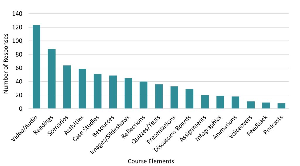 Educators were then asked which of their previously selected course design elements were the most useful or valuable. The top two course design elements educators chose as most useful or valuable were ‘Video/Audio’ (n = 55) and ‘Readings’ (n = 33).