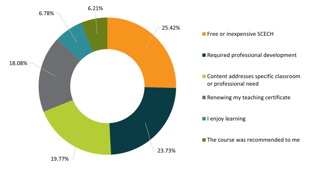 Educators indicated their primary goal for enrolling in professional learning courses through Michigan Virtual was to ‘obtain free or inexpensive SCECHs,’ highlighting the importance of providing accessible course offerings. Indeed, a previous analysis indicated that PL courses offered through Michigan Virtual cost about $38.00 on average; however, half of the courses offered cost less than $5.00 (Cuccolo & DeBruler, 2023).