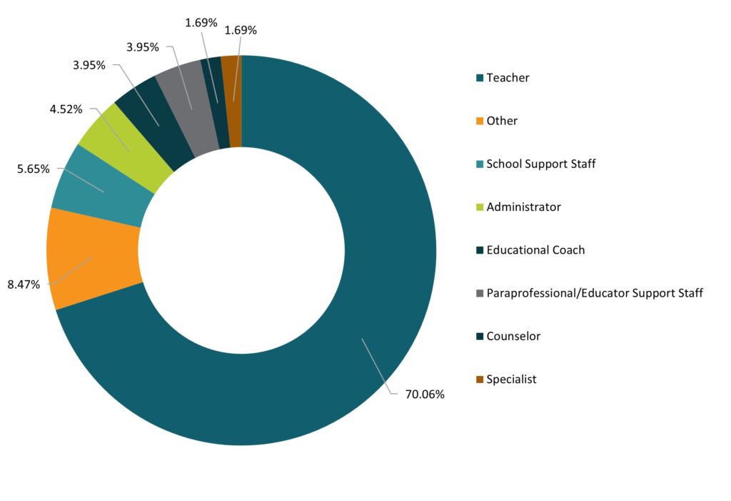 Most educators indicated their primary role was ‘Teacher’ (n = 124, 70.06%), while a smaller proportion of respondents were ‘Other’ (n = 15, 8.47%), ‘School Support Staff’ (n = 10, 5.65%), ‘Administrator’ (n = 8, 4.52%), ‘Educational Coach’ (n = 7, 3.95%), ‘Paraprofessional/Educator Support Staff’ (n = 7, 3.95%), ‘Counselor’ (n = 3, 1.69%), or ‘Specialist’ (n = 3, 1.69%). ‘Other’ responses included childcare providers and assistant professors/teachers. Because educators could skip questions, instances where the total number of responses is less than 177 are noted. See Figure 1 below.