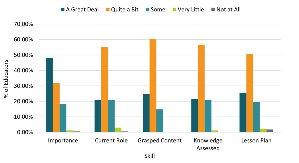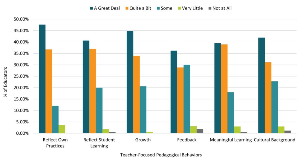 Educators were asked about their beliefs in their abilities to engage in multiple teacher-related pedagogy behaviors after taking their professional learning course. Overall, educators were ‘a great deal’ confident in their skills post-professional learning. Indeed, 47.59% of educators believed ‘a great deal’ in their ability to ‘reflect on their own classroom strategies and practices,’ while approximately 40% reported ‘a great deal’ of confidence in ‘reflecting on students’ learning and progress.’