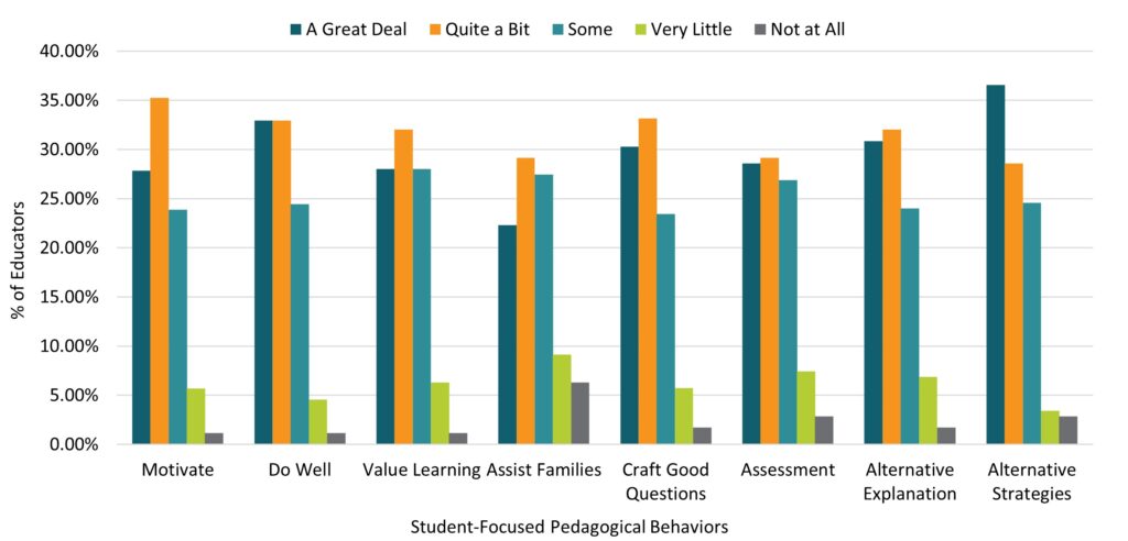 Educators also generally believed ‘quite a bit’ in their abilities across several assessment-focused pedagogy measures. Thirty-three percent of teachers believed ‘quite a bit’ that they could ‘craft good questions for students,’ and 32.00% believed ‘quite a bit’ in their ability to ‘provide an alternative explanation or example when students are confused.’ Beliefs surrounding ‘using a variety of assessment strategies’ were more spread out, but 29.14% believed in their skills ‘quite a bit.’ Notably, 36.57% of educators believed ‘a great deal’ in their ability to ‘implement alternative strategies in the classroom.’ After completing their respective PL courses, very few participants (~1-6%) did not believe in their abilities ‘at all.’ Figure 5 and Table 2 show the percentage of educators who rated their self-efficacy on various student-focused pedagogy behaviors.