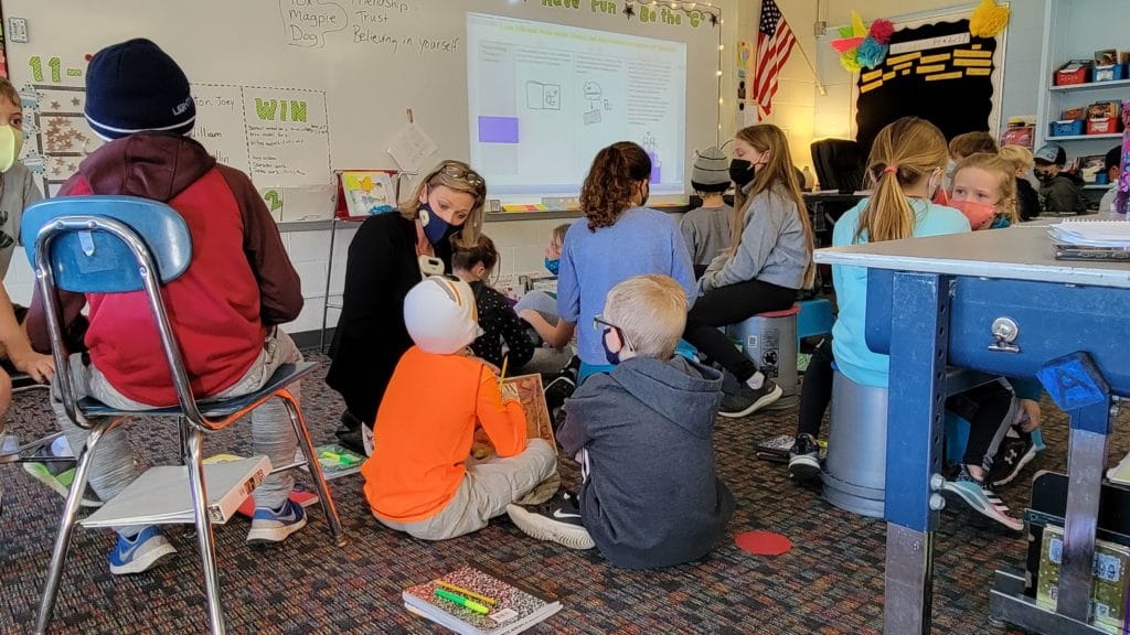 During one lesson in particular, students sat together at the front of the room in different choice-based seating configurations: on the carpet, upside-down buckets with cushions fashioned for a seat, step stools, and in chairs. Through whole group and partner discussion, students identified character traits and themes from a book the class previously read. Students were encouraged to think deeply about the story—about the characters, their motives, and possible themes. This particular lesson was also part of a writer’s workshop activity built around proficiency scales. The class analyzed what it looked like to discuss and write about various themes using evidence to support their thinking and were given examples of what this would look like on a 1 (limited mastery of skill/standard), 2 (partial mastery), or 3 (on track to mastery) proficiency scale. In addition to this particular activity providing a pathway for students to understand how to earn their scores, it was evident that there were many established routines as the lesson moved almost effortlessly between students turning and talking with a partner and having whole group discussions. Students were encouraged to, and felt very comfortable, sharing their ideas with the class.