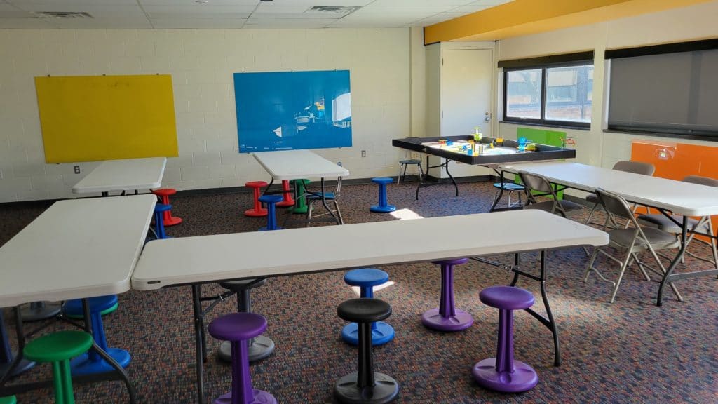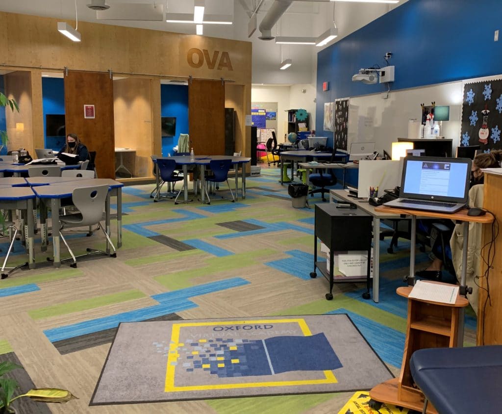 The drop-in centers also provide OVA students with the ability to build relationships with their teachers as well as socialize and develop relationships with their peers. As OVA principal Janet Schell shared: “We try to provide different opportunities to bring students together, to collaborate, and just to get to know each other. If you don’t ever come in, you don’t connect other than Zoom. So we want students to come in as much as possible.” Approximately 30% of their fully virtual students come into the drop-in centers at some point throughout the year. A variety of seating options are available for students including tables, individual workstations, and comfortable couches so they can work individually, with peers, or with a teacher or tutor.