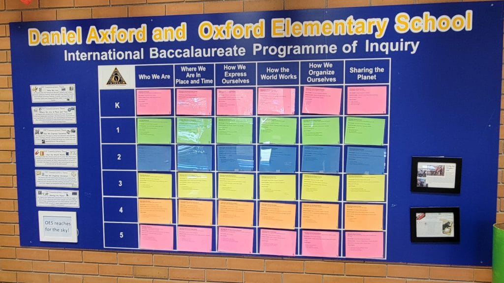 The Primary Years Programme culminates in 5th grade with an exhibition project. This project, and the work leading up to it, gives students the chance to exemplify the attributes of the IB learner profile, demonstrate knowledge and skills they have learned, and to have a voice in making a difference in their community. The exhibition project is very student-driven as students choose their own project based on a topic that is meaningful to them. Scaffolding and preparation take place throughout the years in the PYP to get students ready for this event and the work required of it. The actual exhibition event is a showcase of student work where both students and parents get to see many different forms of learning. Oxford Elementary School principal Jeff Brown described how a previous group of students investigated different types of cancer for their exhibition project. As part of the “student-generated action” component of their project, the students created tee shirts inviting others to ask them about their project and wore them around their local Meijer. As Brown explained, “This was their plan of how they wanted to share their learning with the world: choosing their own topic, doing the research, figuring out how they want to present it, and then actually doing something about it as a result.”