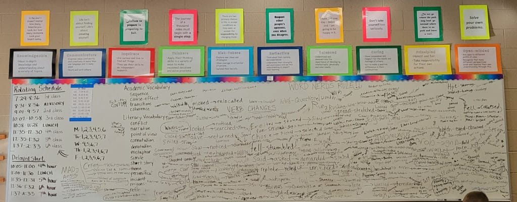 Learning within the MYP is very student-centered at Oxford Middle School and Oxford High School. As the MVLRI research team walked through hallways and visited classrooms, evidence of the commitment to Oxford’s Portrait of a Graduate and the IB learner profile can be seen everywhere. In Neil Peruski’s 6th grade English language arts classroom (language and literature MYP subject group), students demonstrated agency and ownership as they used a rubric to help revise each other’s choice-based personal narrative writing. Rather than a teacher leading the conversation and providing revision suggestions for students, students were leading and driving this peer revision work. A large whiteboard in the classroom served as a “word wall,” encouraging students to consider replacing bland language with more interesting words or phrases. This whiteboard was student-driven, filled with their ideas and contributions, and emphasized that students had a voice and were shaping the learning.