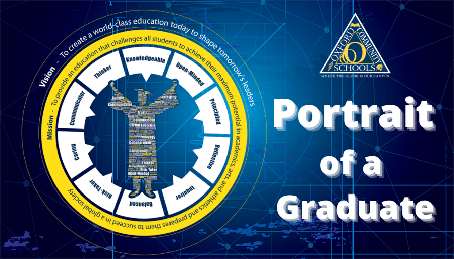 Developed with community input and stakeholder involvement, Oxford’s Portrait of a Graduate articulates their shared vision for all graduates as a result of their educational experiences in Oxford Community Schools. The Portrait of a Graduate outlines the characteristics (based on traits found in the International Baccalaureate Learning Profile), the competencies (skills required to be a productive citizen) they believe are necessary for all students to be successful, and the conditions for learning they envision will allow each student to develop to his or her potential. Completed in 2019, it took about a year and a half to develop as input was gathered from stakeholder surveys, literature on educational trends and 21st-century learning, data generated from the school district, requirements of the Michigan Merit Curriculum, principles and practices of the International Baccalaureate Programme, and processes used to identify future employment opportunities and student career aspirations.