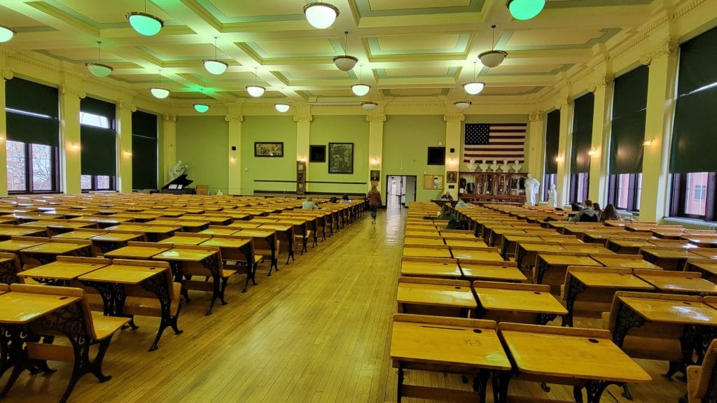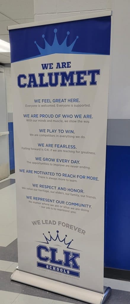 A short walk across the courtyard from the middle school takes us to Calumet High School. Just like at the elementary and middle school, banners throughout the building encourage students to exhibit positive behavior. Group science projects displayed throughout one hallway show different hypotheses that groups of students chose to test as well as their variables, procedures, and conclusions. Throughout the high school, the building’s rich history blends with modern architecture and conveniences: students have access to both the historic study hall—recently renovated to its original design—and a two-story multipurpose space equipped with multiple seating arrangements and plenty of places to charge their school-issued personal devices.