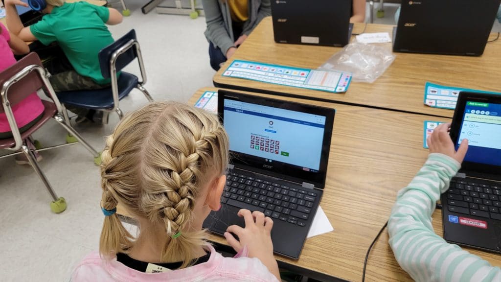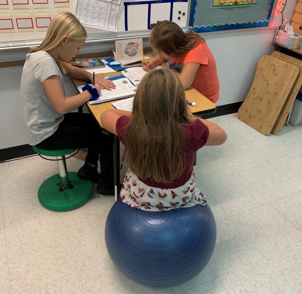 During both the language arts and math blocks, students experience whole-class and small-group instruction as appropriate. Students have a variety of flexible seating options—balance balls, wobble stools, and video rockers—and demonstrate the ability to work independently and in small groups without constant teacher guidance. Technology is available and is used by students during some station rotations, which allows teachers to facilitate small-group instruction or to rotate between groups to guide learning. However, student-centered learning at the elementary level really hinges on the teacher, regardless of what technology is available. The district heard it loud and clear from parents of elementary students that while they felt technology was appropriate at times, it’s not the solution.
