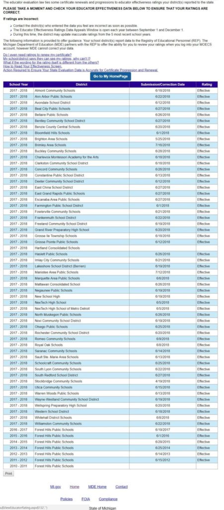 Figure 1. Screenshot of teacher evaluations.This has resulted in confusion and frustration for the teachers who work with Michigan Virtual. As an organization, we would like to work with the Michigan Department of Education (MDE) to help determine the best way to communicate effectiveness ratings for online teachers that provides clarity of responsibility, does not lead to confusion, does not interfere with local actions to be taken as a result of teaching practice, and provides the data the MDE needs for various initiatives and programs it implements. A potential area for consideration is having the employing body, in this case Michigan Virtual, report effectiveness ratings rather than the contracting body – the school district. This may provide a more accurate record and reduce rating variability by district.This situation leads to another foreseeable concern with the current rating system: it does not make a distinction between face-to-face and virtual teaching effectiveness. Many Michigan Virtual teachers teach in a traditional setting for which they receive effectiveness ratings. The current process could lead to instances where the local district provides one rating reflecting the face-to-face setting and the online provider reports a contradictory rating for the person’s virtual teaching effectiveness. A future system that can differentiate and deal sufficiently with this nuance will be important to allow local schools and online providers to take the steps needed regarding ineffective teachers in their respective mediums without the ramification of potentially contradictory ratings.