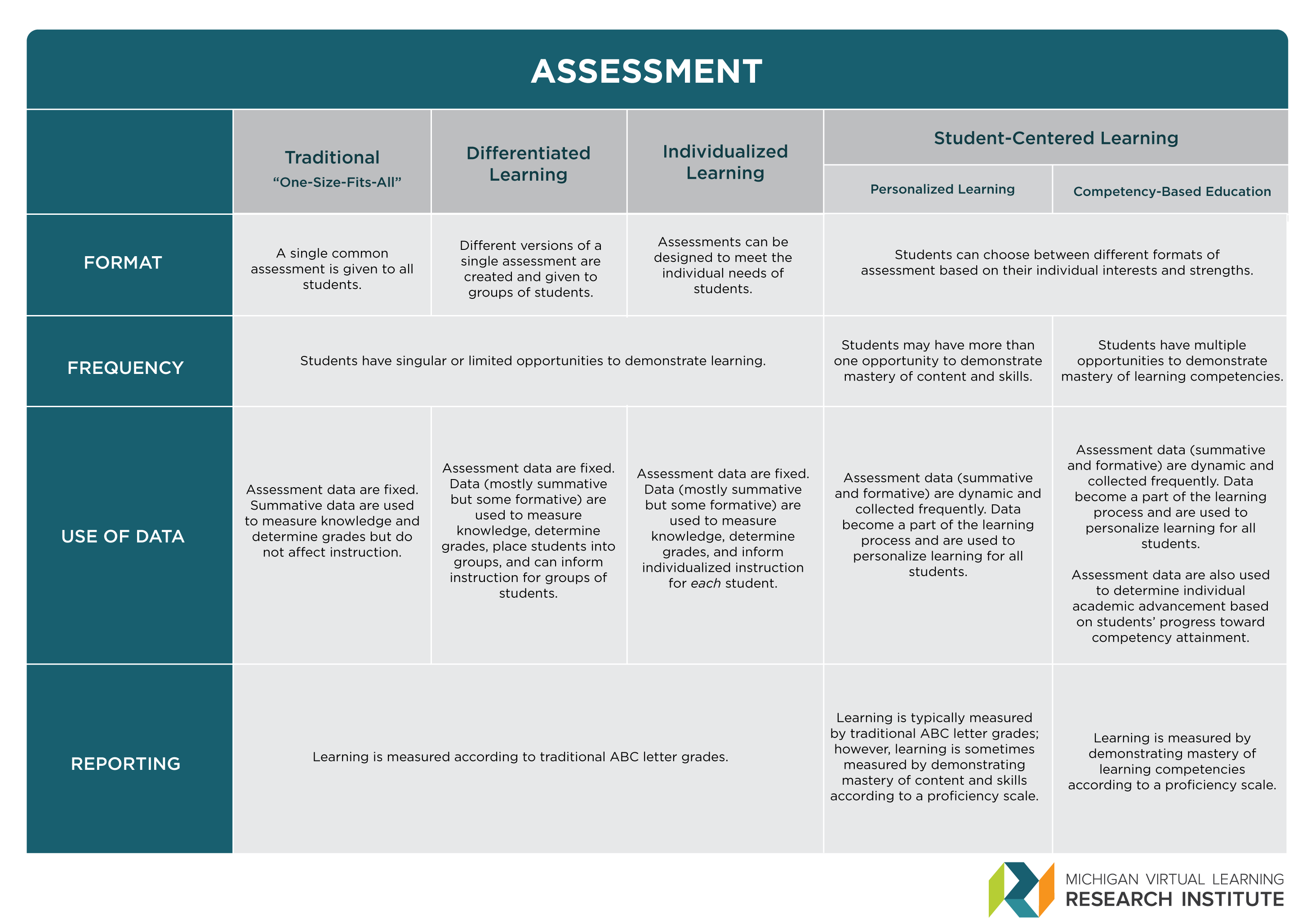 When considering how assessment changes in different models of learning, the matrix focuses on assessment format and frequency, how assessment data are used, as well as how assessment data are measured and reported (see Figure 3).