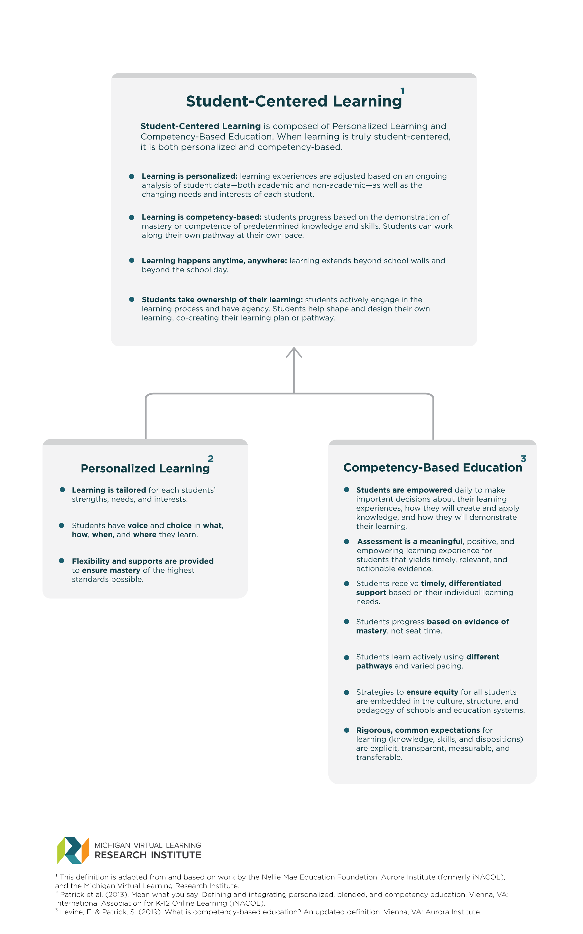In the field of education, the terms student-centered learning (SCL), personalized learning, and competency-based education (CBE) are widely accepted educational philosophies or pedagogical models. While these terms are commonly used and recognized by educators, they are often used interchangeably—and inadvertently incorrectly—as they are related but not the same. In addition, many similar but different definitions exist for each of these terms, which can confuse conversations around these topics. As a result, the Michigan Virtual Learning Research Institute (MVLRI) recognized a need to bring some clarity to not only our own work and how we think about and use these terms but also to how each term is defined and how they are related to one another.