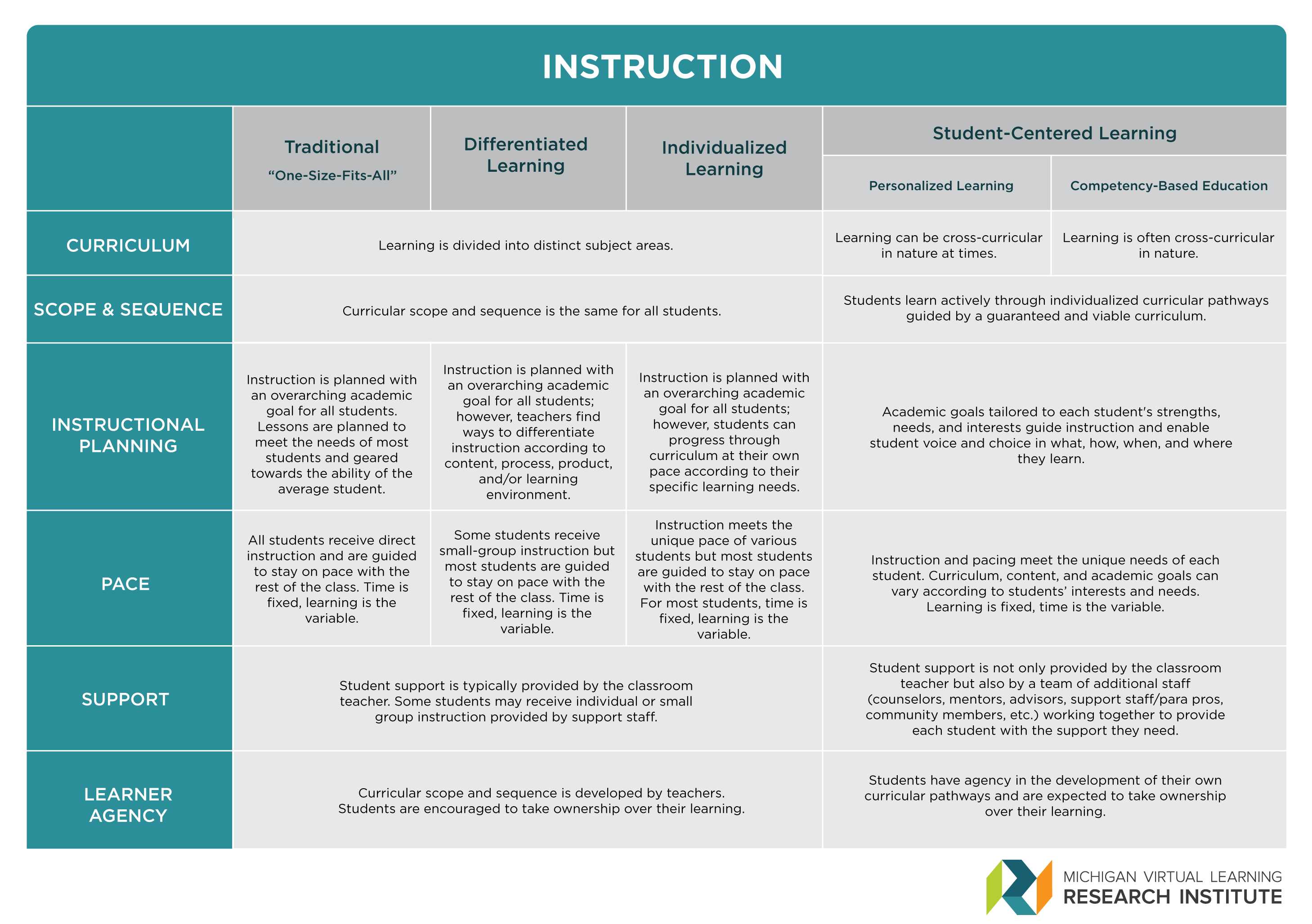 The MVLRI team began by conducting a scan of frameworks and literature that currently exist for each of the three terms above. This work does not intend to redefine any of the three terms but rather identify what seem to be the most widely accepted definitions that exist in the field of K-12 education. Further, it seemed beneficial to provide insight into how different elements of education—instruction, assessment, and school operations—look when viewed through different educational models.
