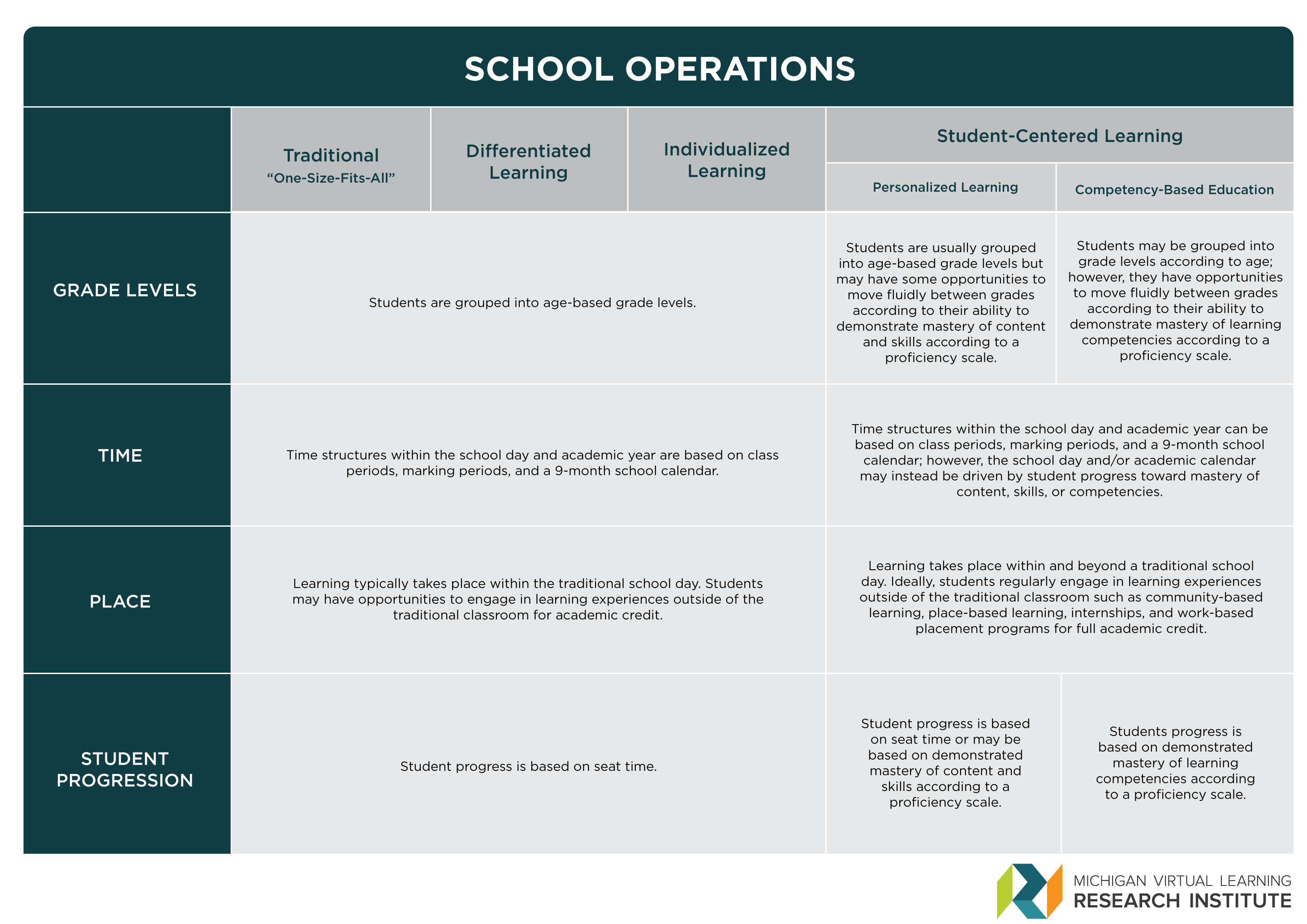 The matrix shown below in Figure 4 focuses on how school operations change in different models of learning by considering: how grade levels are used to group students, how time is structured, where learning takes place, and how student progress is measured.